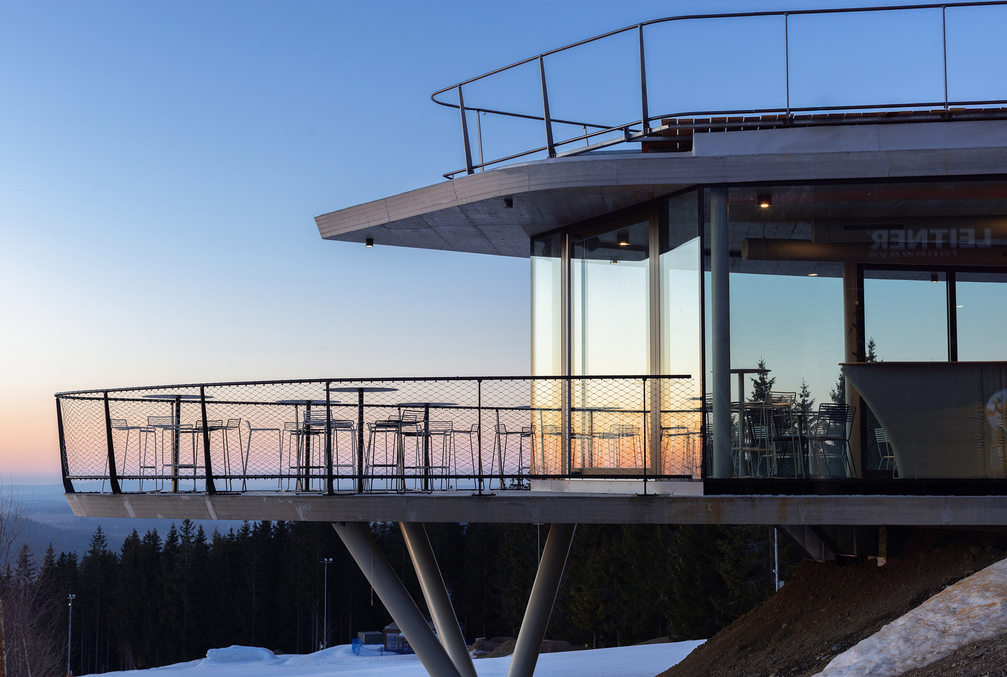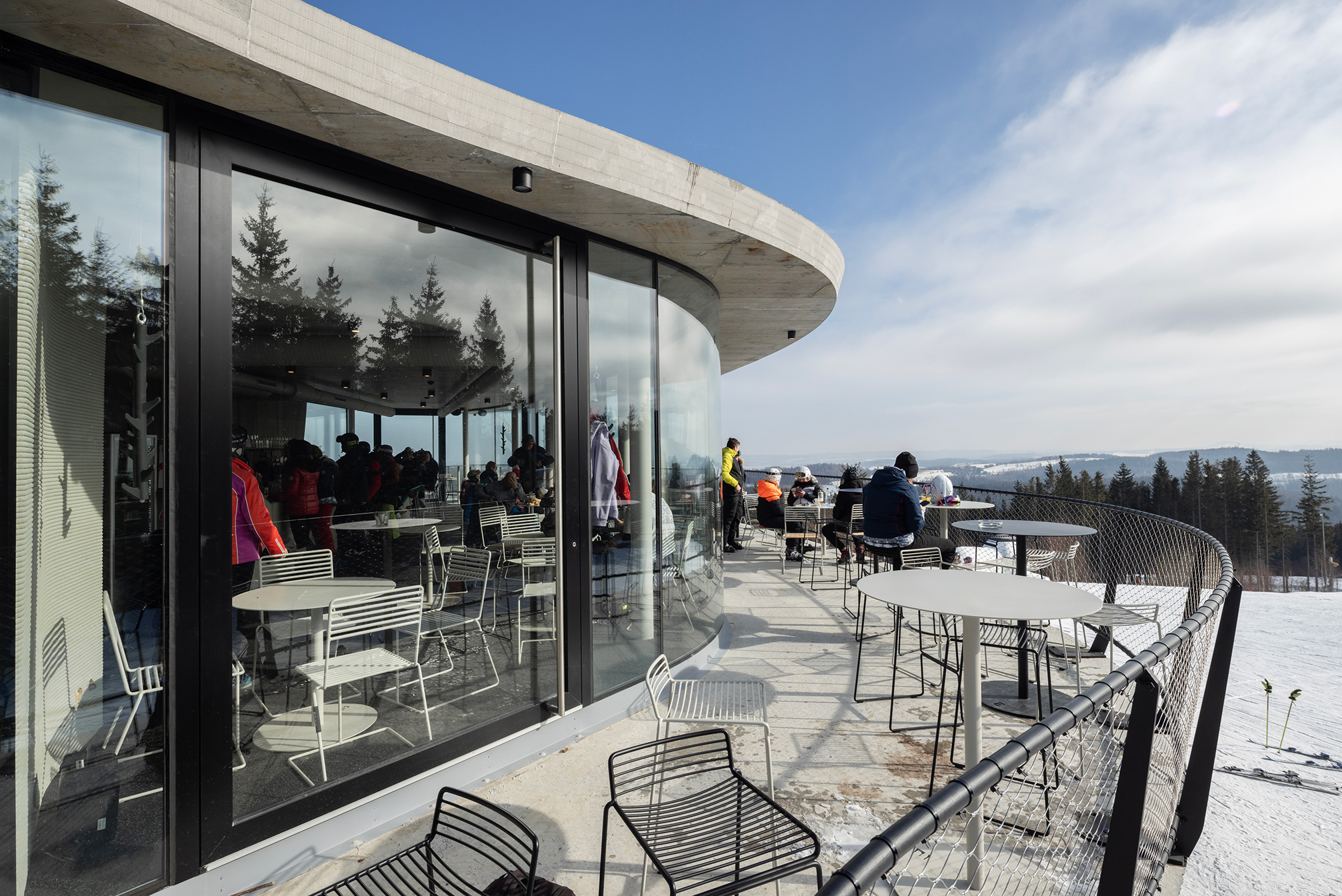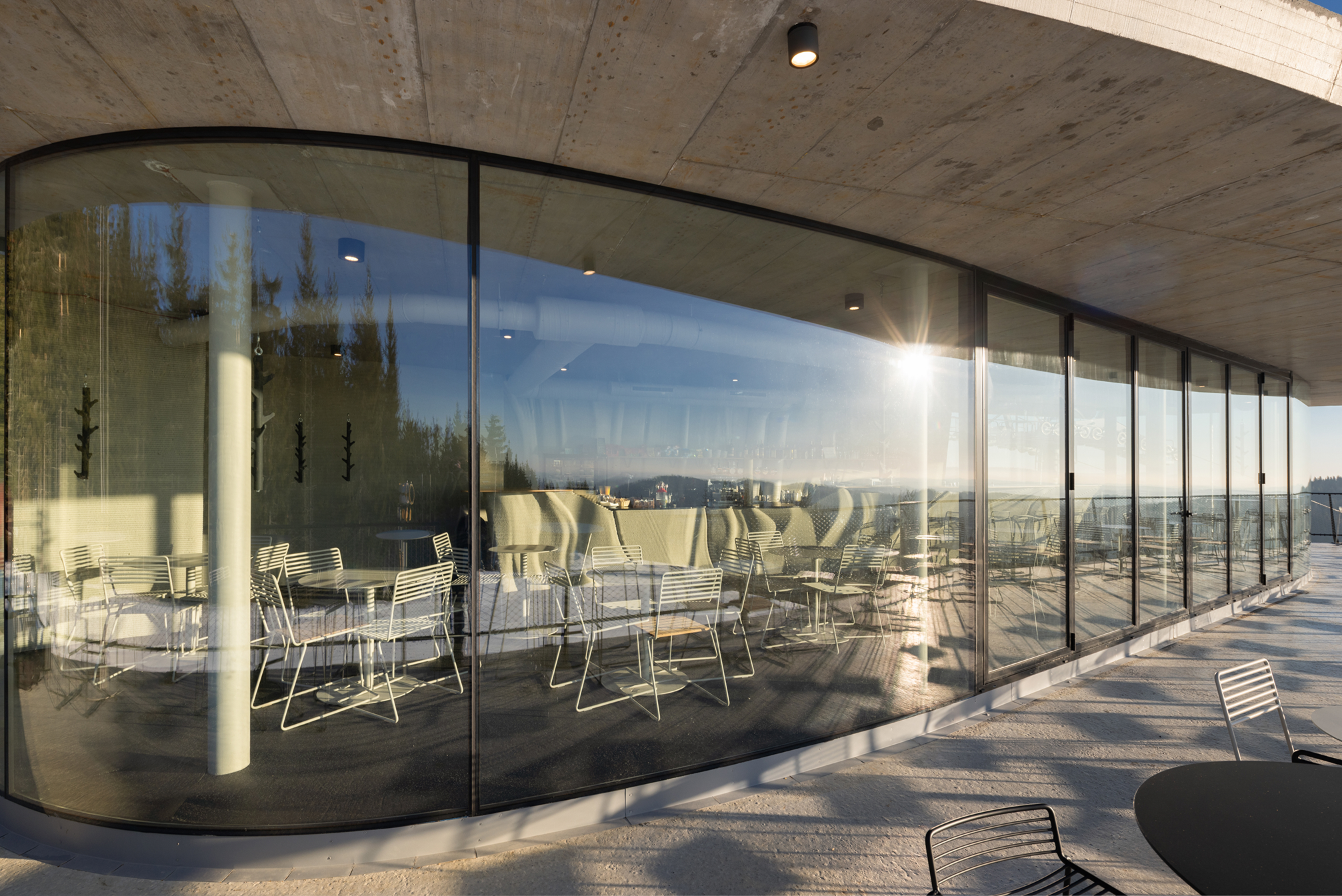 Frameless arched windows offer an absolutely unobstructed view of the majestic Jeseníky landscape. The entire station was built using 3D printing. It is the highest-altitude building in the Czech Republic to have been constructed with this technology.
