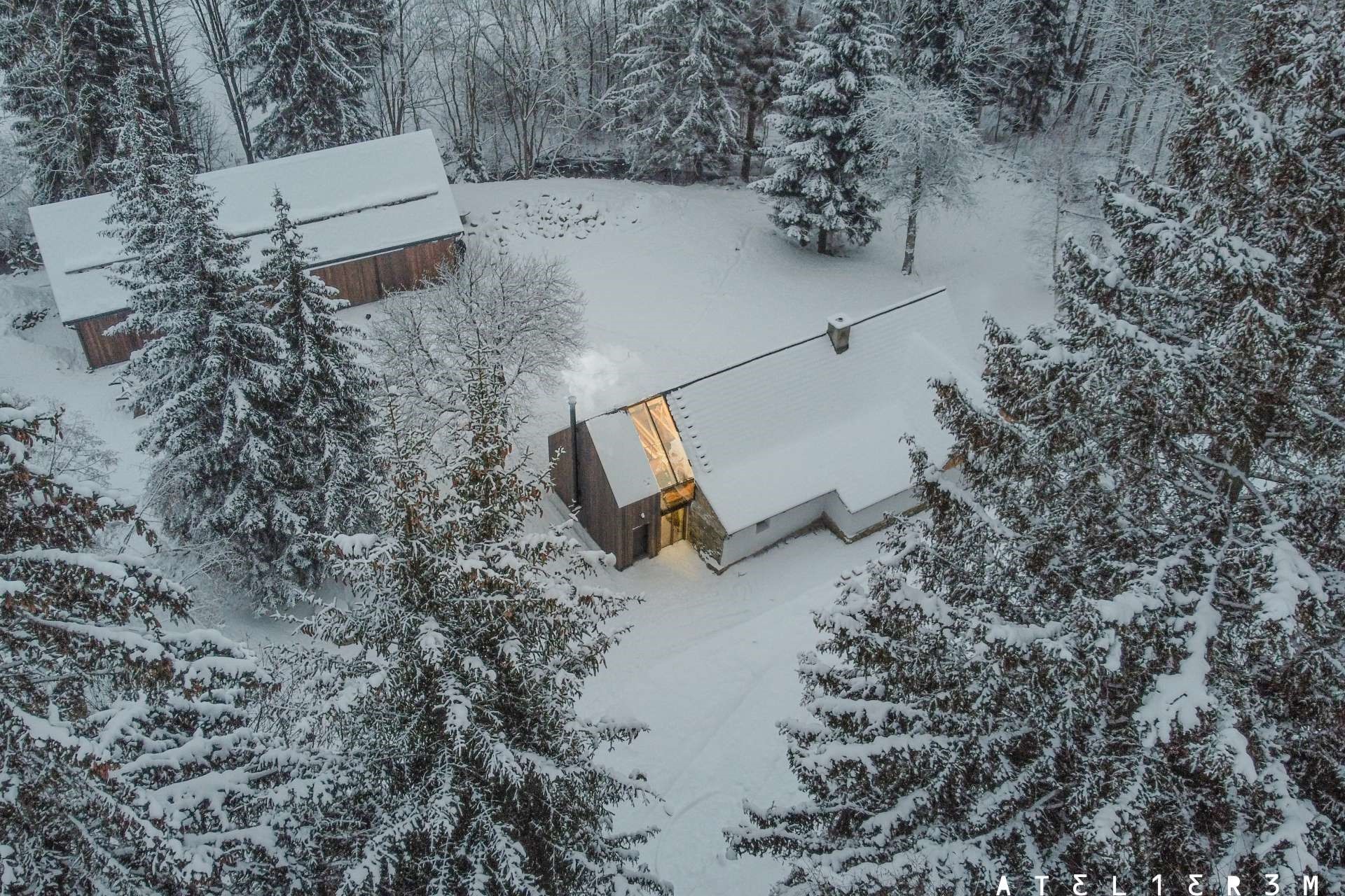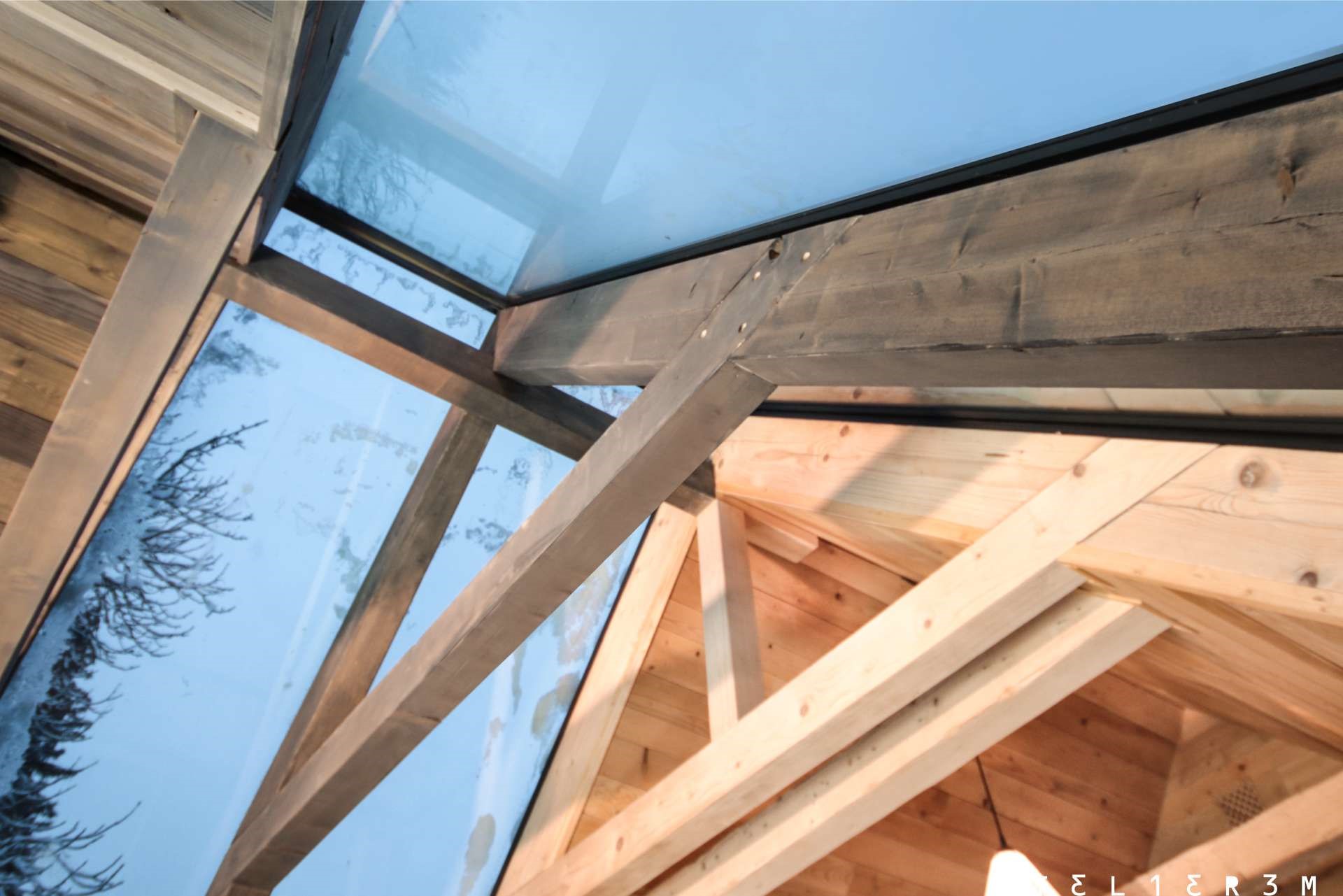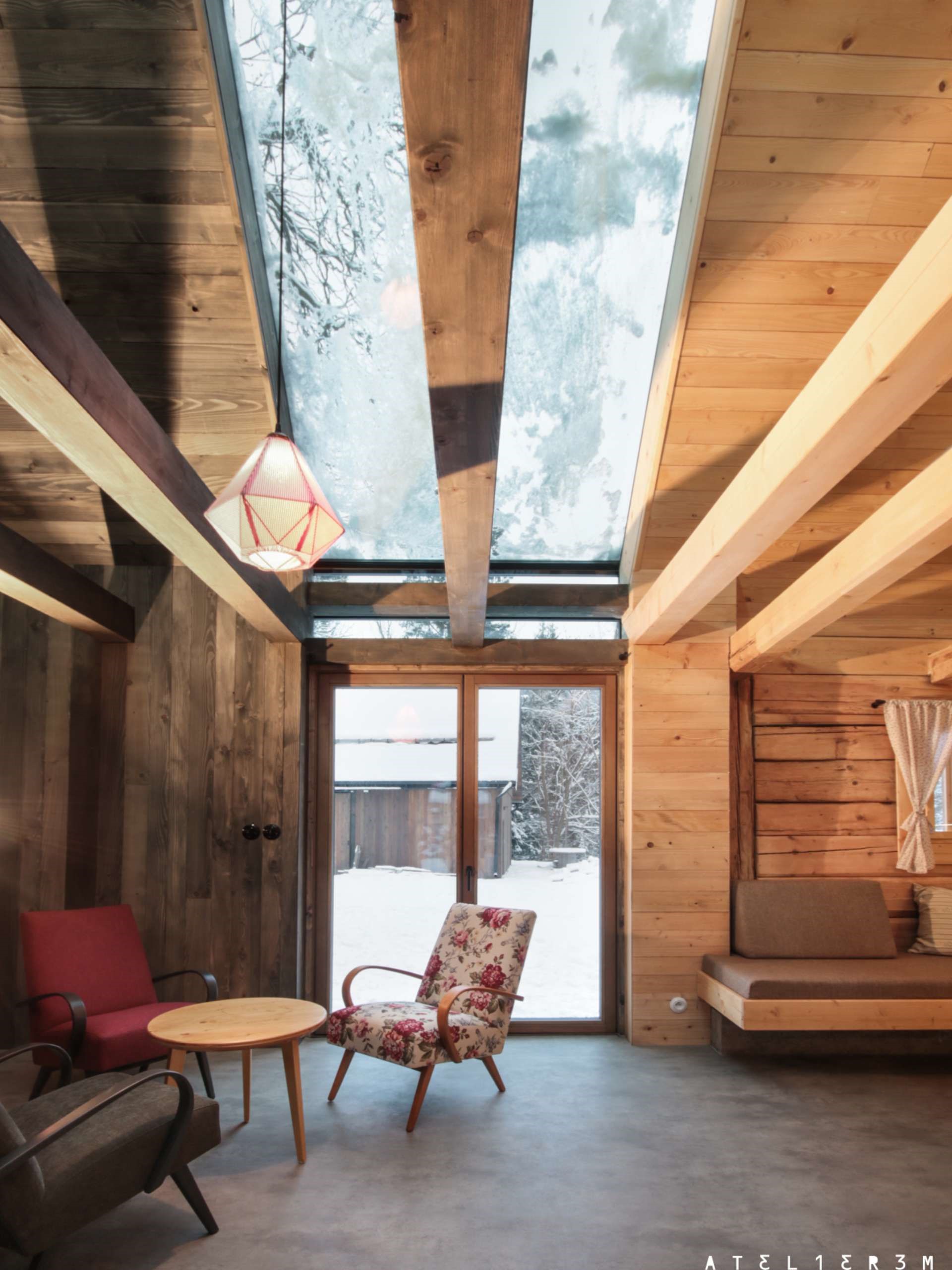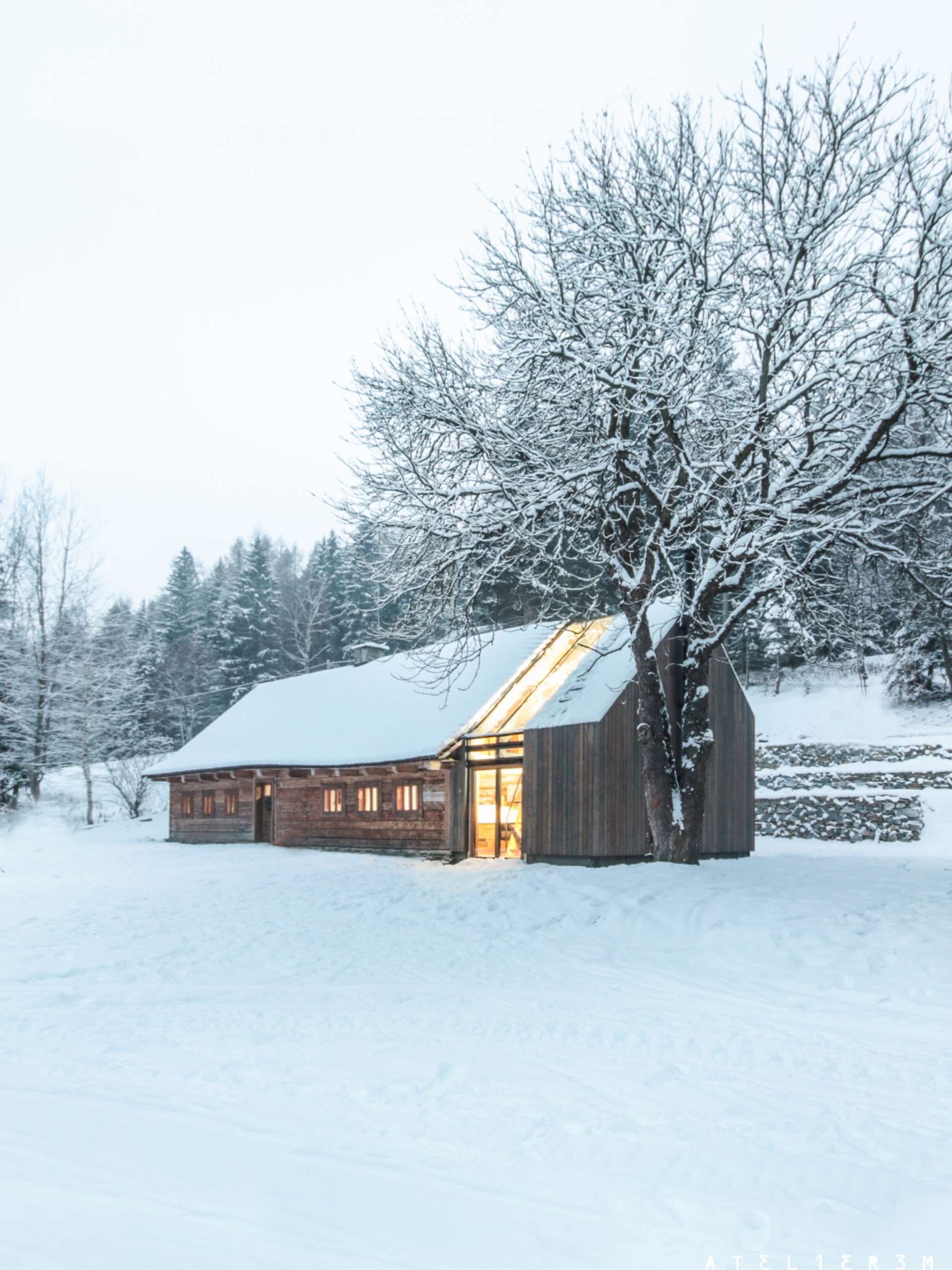 By using modern glass elements in the reconstruction of log cabin in the mountains, a unique solution can be achieved.